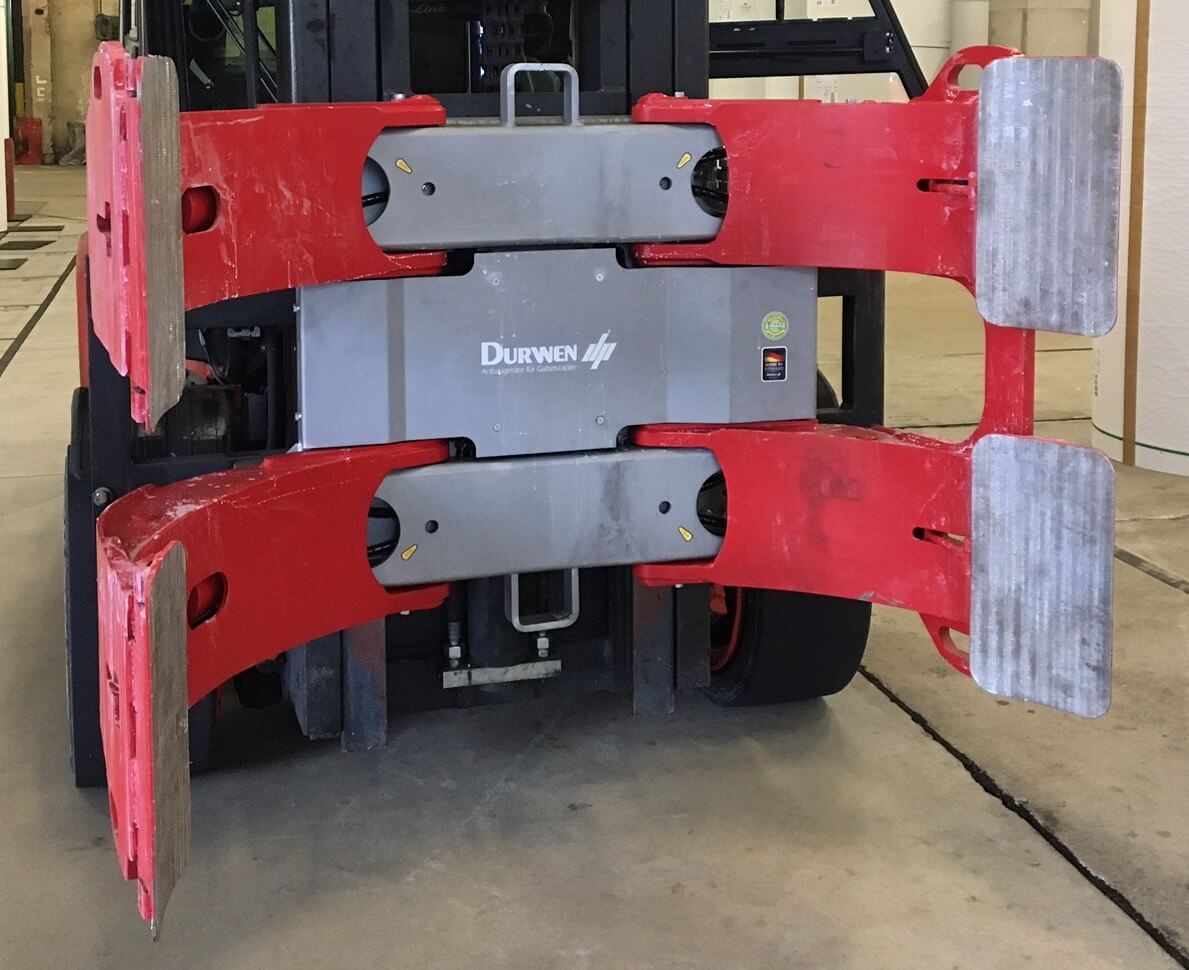 The Durwen PRK type paper roll clamp with 180° rotation has slimline arm profile and is available in different sizes and configurations. Its rack and pinion drive enables fast and soft rotation with a soft stop. It can be rotated to both directions. Standard contact plates has steel grip profile, but other surfaces are also available upon request.